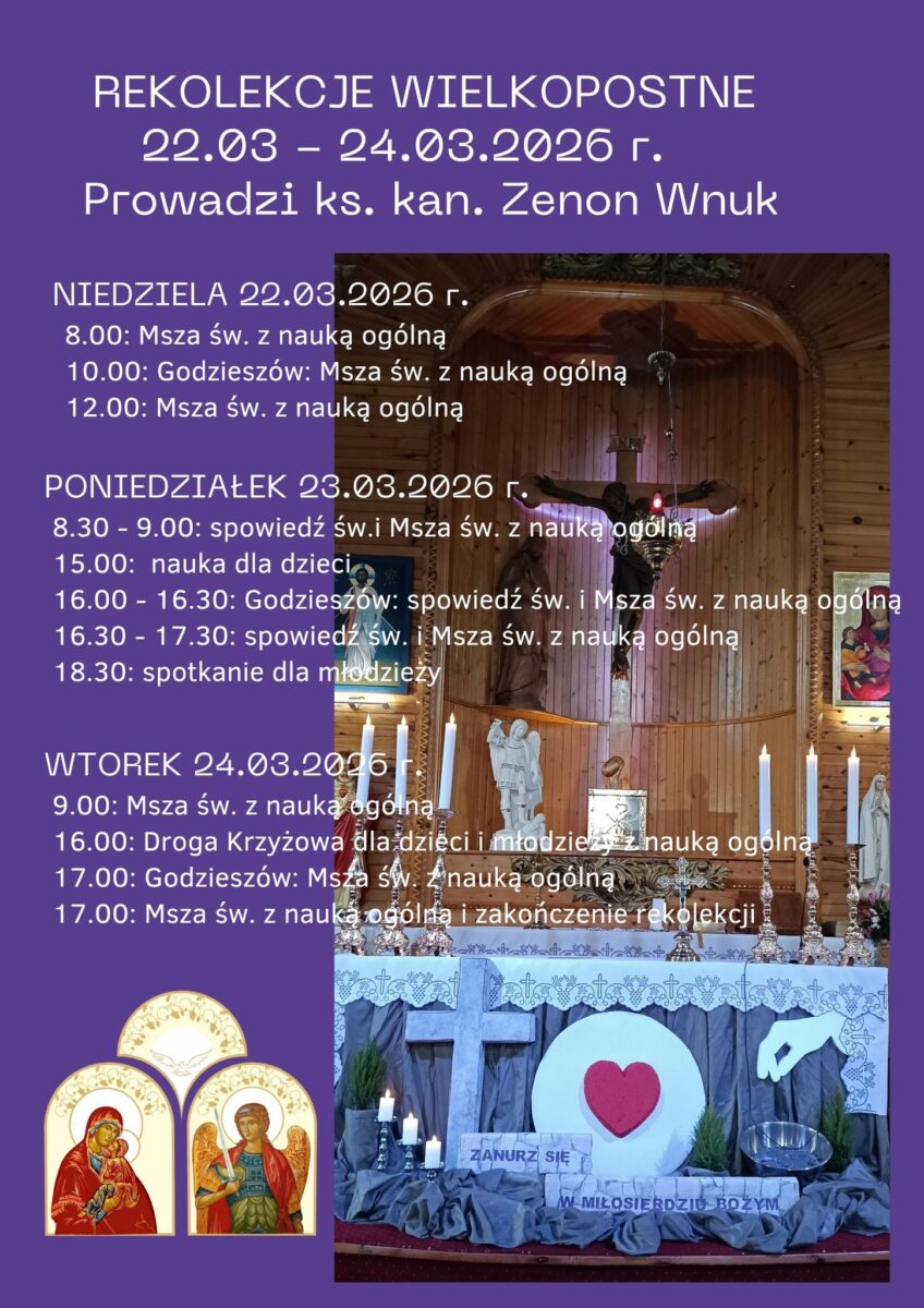Informacje duszpasterskie IV Niedziela Wielkiego Postu – Laetare 15. 03. 2026 r.2026-03-16 Udział0 Powiązane postyFestyn PARAFIALNO – RODZINNYCzytaj więcejStandardy ochrony dzieci parafia WykrotyCzytaj więcejWielki czwartekCzytaj więcej